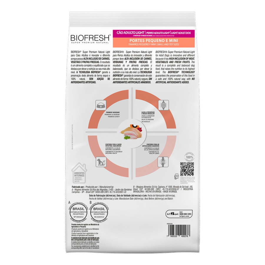 Biofresh Super Premium Light es un alimento completo, equilibrado, con palatabilidad reforzada, indicado para una pérdida de peso eficaz y posterior mantenimiento, de manera saludable en perros adultos y senior con tendencia al sobrepeso u obesidad. Biofresh Light promueve la pérdida de peso, ya que posee un 70% menos de grasas y 20% menos de calorías, alta inclusión de L-carnitina para un correcto metabolismo de las grasas y preservación de la masa muscular. Esta fórmula, más el aumento de proteína y fibra, adicionado a la protección articular que fomenta la actividad física, es la receta para recuperar la condición corporal ideal. Una excelente opción para perros con sobrepeso, que incorpora manzanilla para reducir la ansiedad, entregando de esta manera la nutrición necesaria para lograr el peso ideal.