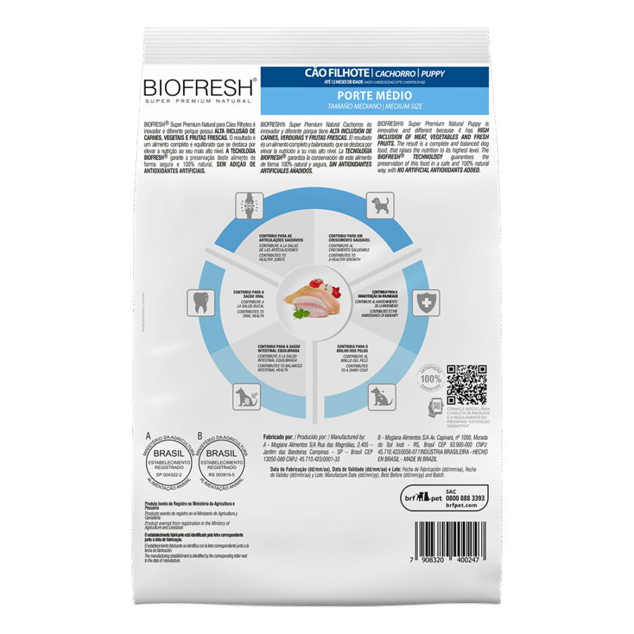 Biofresh Súper Premium es un alimento 100% natural que incorpora ingredientes frescos de alto valor nutritivo, de forma completa y equilibrada, optimizando el desarrollo de cachorros. Con alta inclusión de carnes frescas, proteína de alto valor biológico y gran digestibilidad; acompañado de frutas, verduras, legumbres frescas y con granos nobles en cantidades óptimas. Además Biofresh Súper Premium incorpora ingredientes funcionales para fortalecer el sistema inmune, favorecer la salud de piel y pelaje, mantener un correcto funcionamiento intestinal y cuidar desde etapas tempranas la salud oral y articular de su mascota. Adaptado a las necesidades nutricionales de cachorros de razas medianas, y a los requerimientos según su tamaño, con croquetas diseñadas para su fácil masticación.